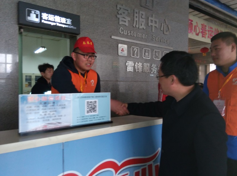成书记一行先后来到售票厅、旅客候车厅、旅客预约服务台、雷锋服务台、青年志愿者工作站等处与志愿者亲切交流。成书记仔细询问了志愿者工作开展的基本情况、工作内容、服务感受等,对志愿者牺牲春节假期积极参与春运志愿服务的行为给予充分肯定,并向志愿者做出的贡献表示衷心的感谢。他鼓励志愿者,要大力弘扬“奉献、友爱、互助、进步”的志愿精神,要在春运志愿服务过程中受教育、长才干、做贡献。