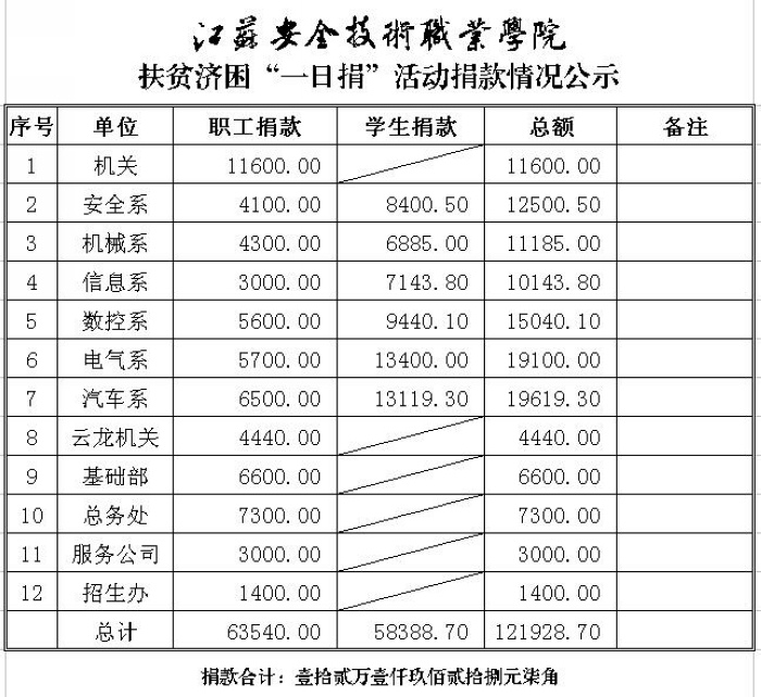 本次活动共募得善款人民币121928.70元(壹拾贰万壹仟玖佰贰拾捌元柒角),其中教职工捐款63540.00元(陆万叁仟伍佰肆拾元整),学生捐款58388.70元(伍万捌仟叁佰捌拾捌圆元柒角)。募集善款将上交民政部门,全部用于城乡扶贫济困,低保等困难家庭的救助,助医、助老、助孤、助学和慈善超市等专项救助。