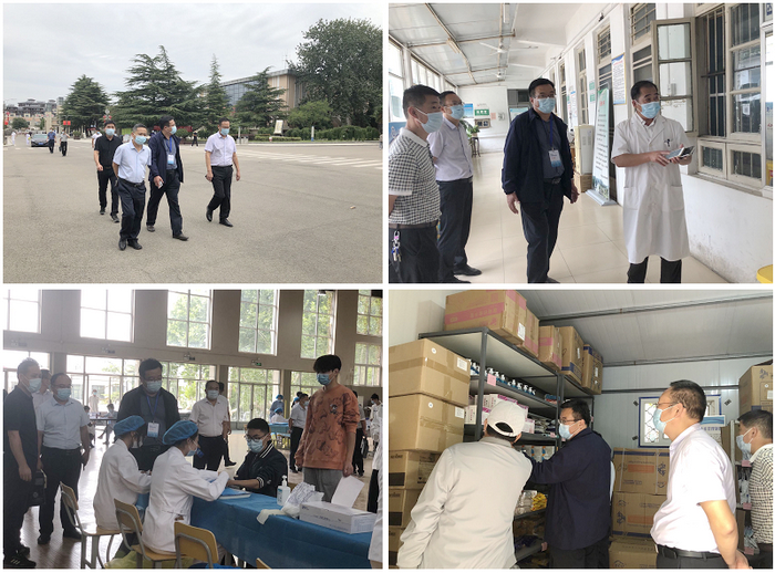 张兆成一行实地查看了学校门岗、学生宿舍、医务室、学生食堂、隔离点等重点场所,详细询问了防疫物资储备、场馆环境消杀等情况;还现场察看了2022级新生入校体检情况并给予了指导?/span>
