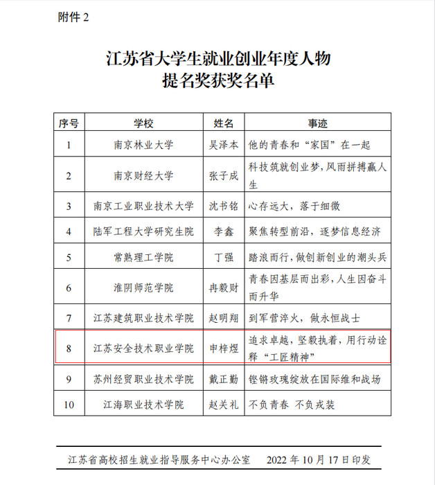根据江苏省教育厅《省教育厅办公室关于开展江苏省大学生就业创业年度人物典型事迹征集活动的通知�(苏教办指函�2022�1�)精神� 我院开展了大学生就业创业年度人物评选活动。经过学校推荐、专家评审,由机械工程学院推荐的2020届数控技术专业学生申梓煜在全省脱颖而出,荣获江苏省大学生就业创业年度人物提名奖�