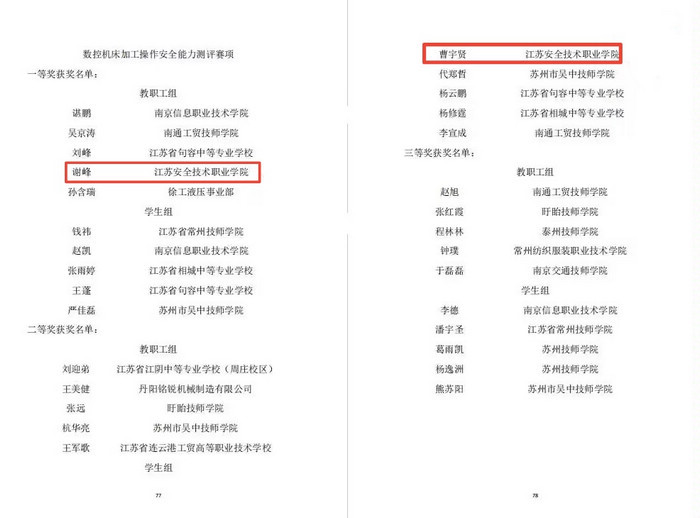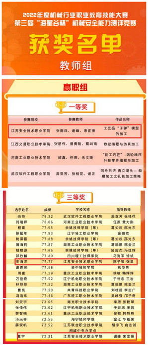�11�3日结束的“江苏工匠”岗位练兵职业技能竞�--2022年江苏省智能制造与建造安全能力测评竞赛上�经过激烈角逐,谢峰老师获得数控机床加工操作赛项教职工组一等奖、宋宜振老师指导的曹宇贤选手获得了学生组二等奖第1名。竞赛文件规定谢峰老师将由省人力资源和社会保障厅授予“江苏省技术能手”称号�