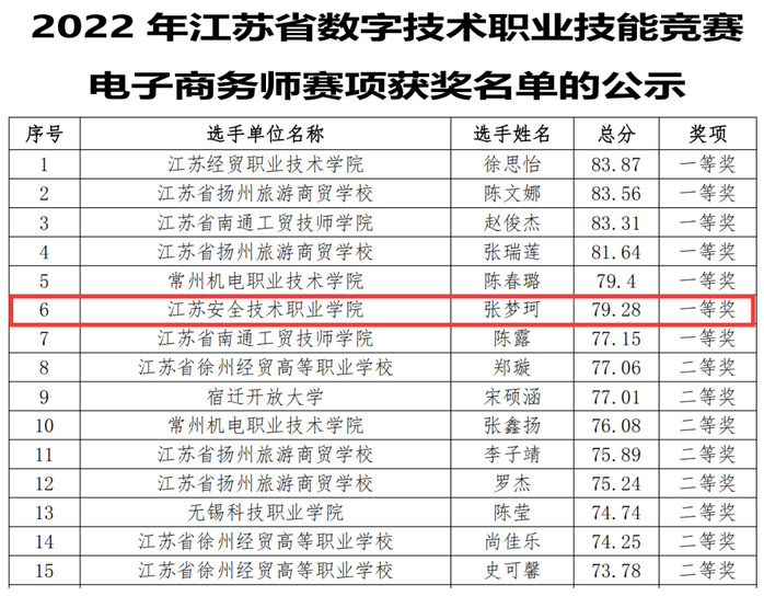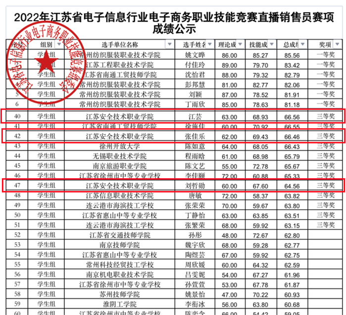 近日?/span>“江苏工匠”岗位练兵职业技能竞?/span>电子商务类比赛成绩揭晓,?/span>2022年江苏省数字技术职业技能竞赛电子商务师赛项中,商贸与人文学院教师孙莹莹指导的学生张梦珂荣获一等奖,晋级国赛。在2022年江苏省电子信息行业电子商务职业技能竞赛直播销售员赛项中,江芸、刘哲勋、张佳乐三名同学荣获省三等奖?/span>
