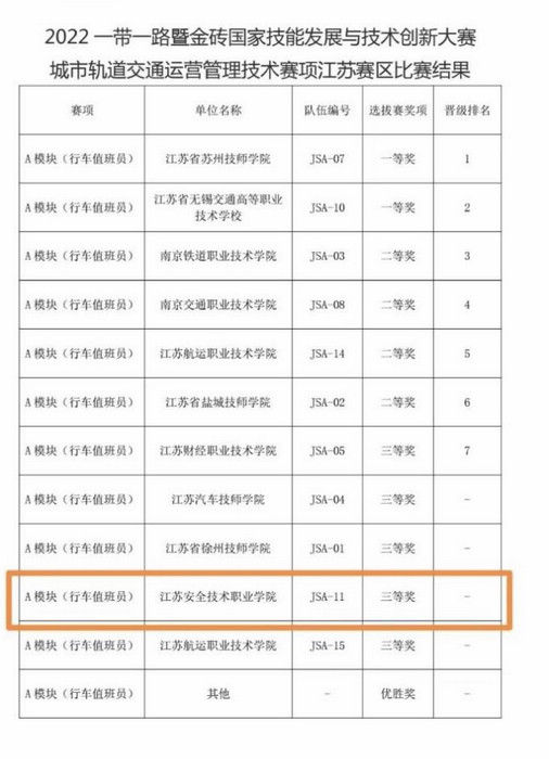 12?/span>3日,在一带一路暨金砖国家技能发展与技术创新大赛中,由我院交通与安全学院教师王平、金月娥指导的吴荣广、王安钢、王启龙同学在城市轨道交通运营管理技术赛项江苏赛区比赛中喜获三等奖?/span>
