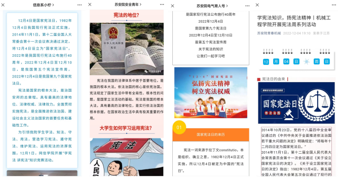 各二级学院将学习宪法作为“宪法宣传周”期间各班级团课的主题,并通过所属微信公众号发布推文?/span>将学习活动与日常管理相结合提升学生的法治意识。全院学生积极参与,充分学习领会宪法在国家法律体系中的重要地位,弘扬了法治精神,传播了法治文化,增强了同学们的法治观念和法治意识,让同学们意识到尊崇宪法,积极学习宪法的重要性。同时,各二级学院细化工作举措,以这一活动为契机,继续在全体学生中开展“学宪法 讲宪法”活动网络学习和“宪法卫士”行动计划,进一步提升学习活动的参与率和覆盖率,确保活动取得实效。此次网上学习得到了全院学生的广泛参与,平均分达到了84.98分,实现了学习教育活动广覆盖、见实效。在晚自习时间,还组织了全体学生观看“宪法之治”等微视频,立足当代大学生思想、学习和生活实际,促使学生成为宪法的忠实崇尚者、自觉遵守者、坚定捍卫者?/span>