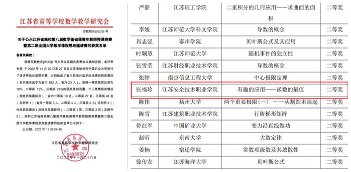 近日,江苏省高校第八届数学基础课青年教师授课竞赛暨第二届全国大学数学课程思政邀请赛成绩公布。我院基础课教学部张福珍老师喜获二等奖�