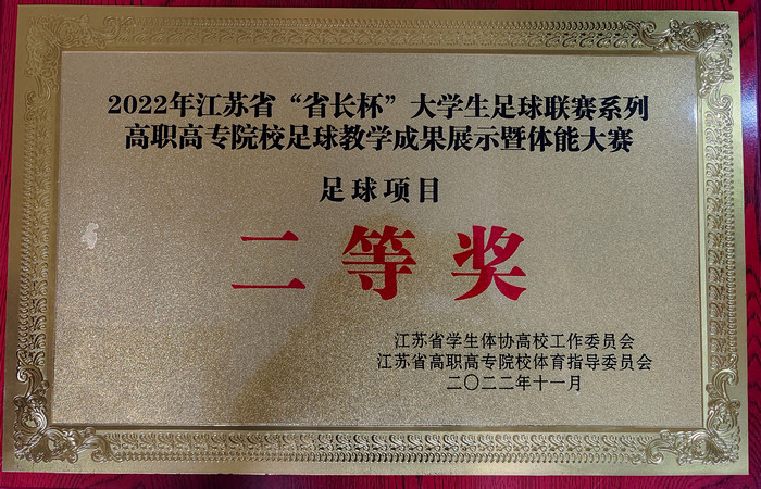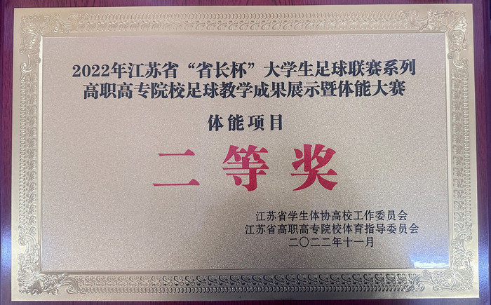 近日,在2022年江苏省“省长杯”大学生足球联赛系列高职高专院校足球教学成果展示暨体能大赛中体能项目上,我院参赛选手获团体二等奖、足球项目获团体二等奖。李劲同学在足球十部位颠球单项比赛中获得一等奖,达斯坦·白山同学在足球打点单项比赛中获得三等奖,王佳乐同学在体能男子全能王比赛中获得二等奖�