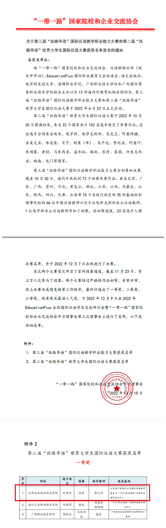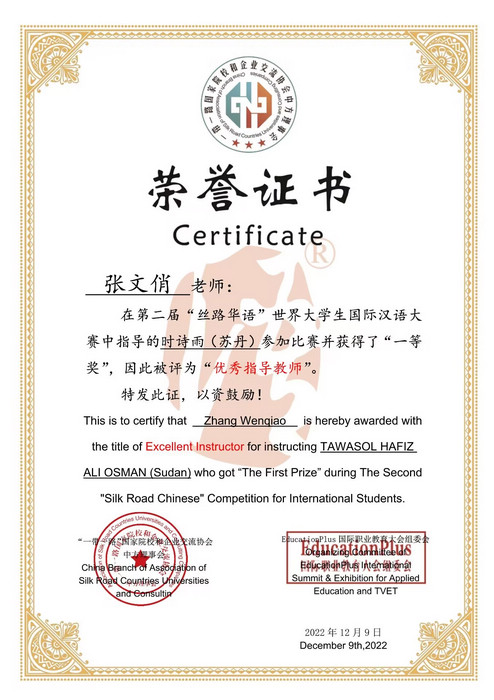 在第二届“丝路华语”世界大学生国际汉语大赛比赛期间,我院积极组织备赛,其中,由我院张文俏老师指导的苏丹学生的作品“我的汉语情中国梦”荣获一等奖,张继光、鲍小沾、段焜等老师指导的学生作品荣获优秀奖�
