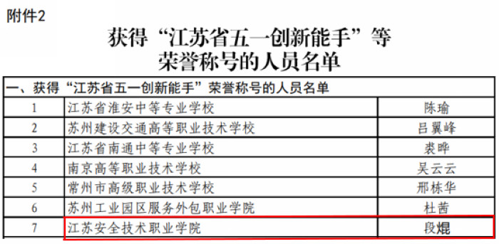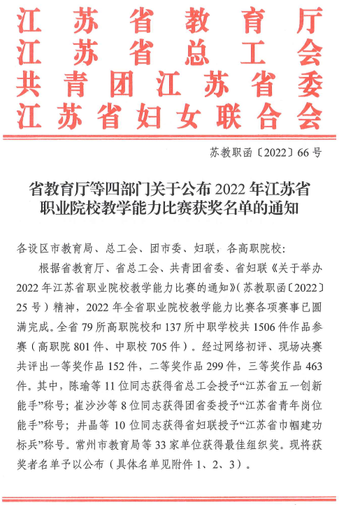 近日,省教育厅、省总工会、团省委、省妇联联合发文,公布了2022年江苏省职业院校教学能力比赛获奖名单?/span>我院参赛团队荣获一等奖1项,二等?/span>2项,三等?/span>4项。其中段焜、赵慧娟、刘天涯、刘艳梨团队获专业组一等奖第一名。段焜同志获得江苏省总工会授予的“江苏省五一创新能手”称号。我院获?/span>2022年江苏省职业院校教学能力比赛最佳组织奖,也是唯一获此殊荣的在徐高职院校?/span>