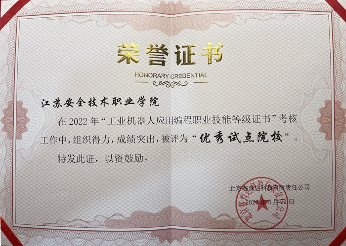 近日,教育主管部门指定的“工业机器人应用编程职业技能等级证书”评价组织北京赛育达科教有限公司,对2022年�1+X”证书试点工作进行总结。我院在2022年“工业机器人应用编程职业技能等级证书”考核工作中,组织得力,成绩突出,被评为“优秀试点院校”�