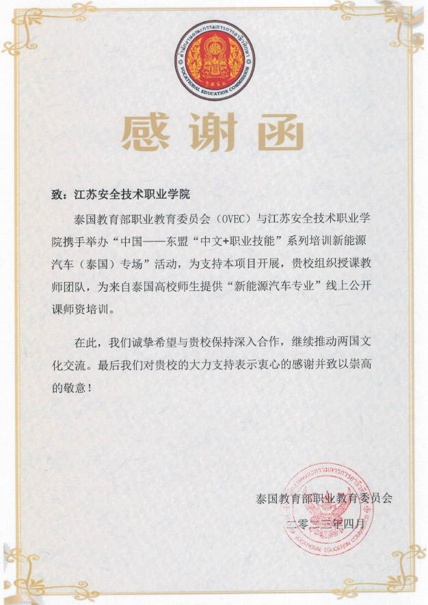 近日,泰国教育部职业教育委员会向我院发来感谢函,向我院为泰国高校师生提供“新能源汽车专业”培训表示感谀�
