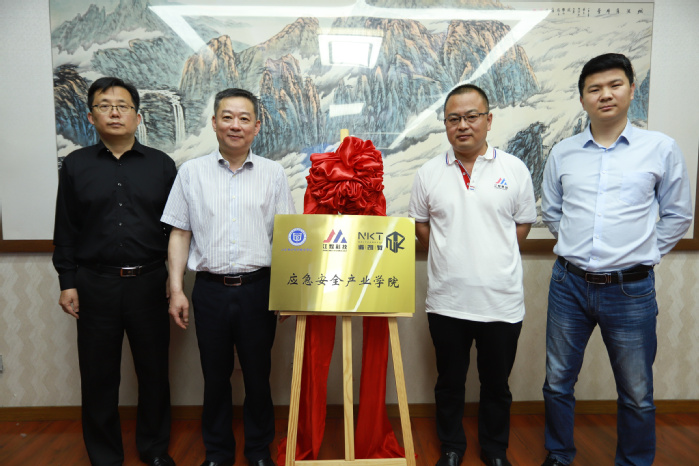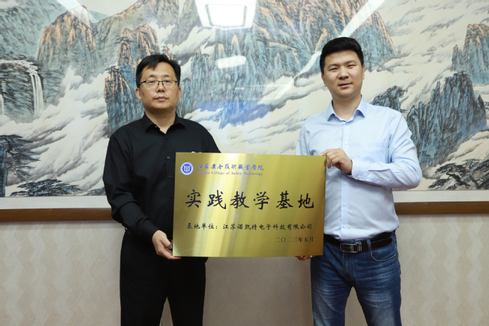 仪式上,张东良、吉智和渠慎月、张旭生共同为“应急安全产业学院”揭牌。吉智代表学院向徐州江煤科技有限公司、江苏诺凯特电子科技有限公司授“实践教学基地”牌�
