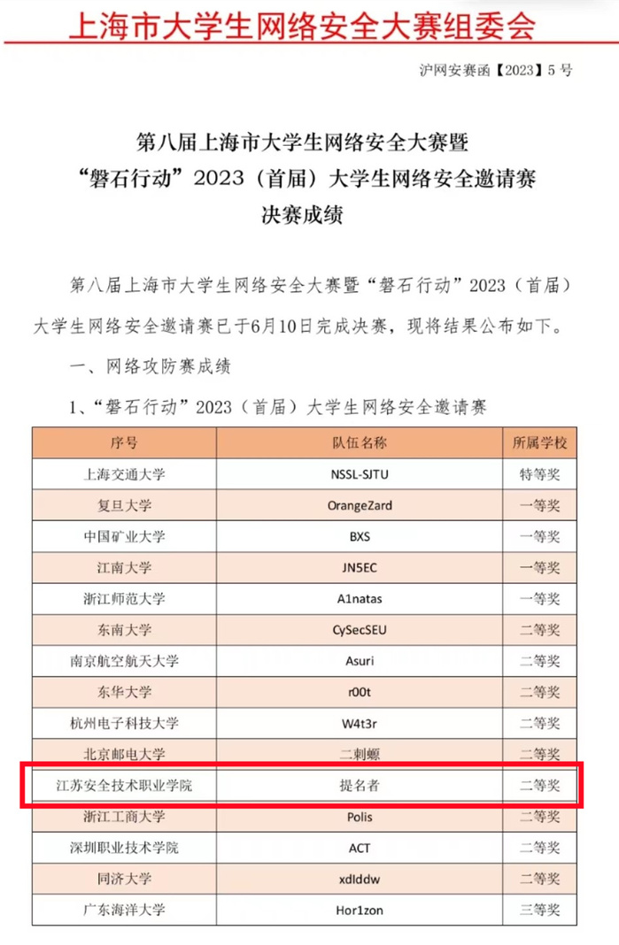 6�10日,第八届上海市大学生网络安全大赛暨“磐石行动�2023(首届)大学生网络安全邀请赛决赛在东华大学举行。我院“提名者”战队学生崔智铭、何政敏、姚元勋获得二等奖,实现了学院在本项赛事中零的突破�