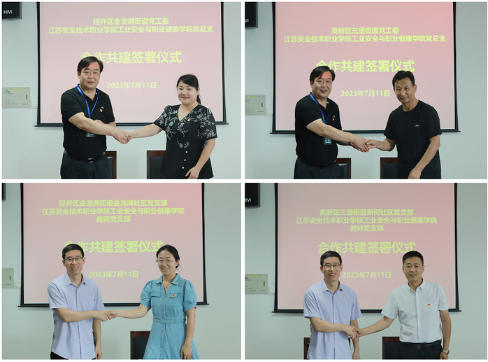 王莹、夏雪松简要说明了此次到访的目的并介绍了街道基本情况。他们表示,近年来,徐州市积极创建综合减灾示范社区,提升社区居民的防灾减灾意识,增强居民自救能力。工业安全与职业健康学院党总支与金龙湖街道党工委、三堡街道党工委,工业安全与职业健康学院教师党支部与金龙湖街道金龙湖社区党支部、高新区三堡街道新何社区党支部分别签订合作共建协议。双方将以“示范社区”建设工作为切入口,在灾害信息员培训、安全类专业学生实习等领域开展深入合作�