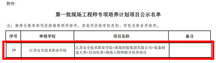 近日,江苏省第一批现场工程师专项培养计划项目遴选结果公示,我院与淮海控股集团有限公司联合申报的项目《装备制造大?/span>+自动化类+现场工程师联合培养项目》成功入选?/span>