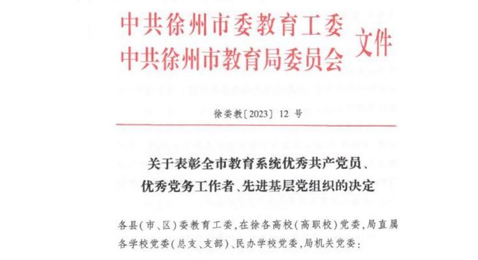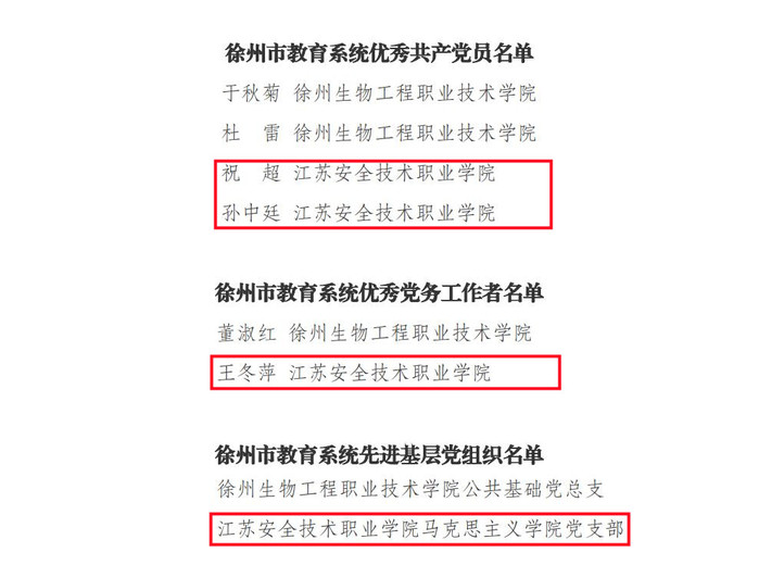 近日,中共徐州市委教育工委、中共徐州市教育局委员会下发了《关于表彰全市教育系统优秀共产党员、优秀党务工作者、先进基层党组织的决定》,对全市教育系统先进基层党组织、优秀共产党员、优秀党务工作者予以表彰。在此次表彰中,我院工业安全与职业健康学院祝超同志、网络与信息安全学院孙中廷同志被表彰为“徐州市教育系统优秀共产党员”,商贸与人文学院党总支副书记王冬萍被表彰为“徐州市教育系统优秀党务工作者”,马克思主义学院党支部获“徐州市教育系统先进基层党组织”?/span>