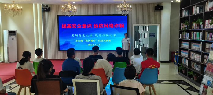 7�24日,“星火相传”社会实践团来到徐州市贾汪区大泉街道新泉社区,开展主题为“提高安全意识,预防网络诈骗”的知识宣讲。活动中,团队成员们用通俗易懂的语言向社区居民宣传防诈、反诈知识,通过贾汪区真实的网络诈骗案例,介绍了典型的诈骗套路、方法、特点,以及发现被骗后应采取的补救措施。还向社区居民发放了预防网络诈骗宣传手册,宣传防诈口诀,普及辨别电诈的方法以及预防措施,现场指导社区居民安装“国家反诈中心�APP,切实提高对电诈的识别能力和应对能力�