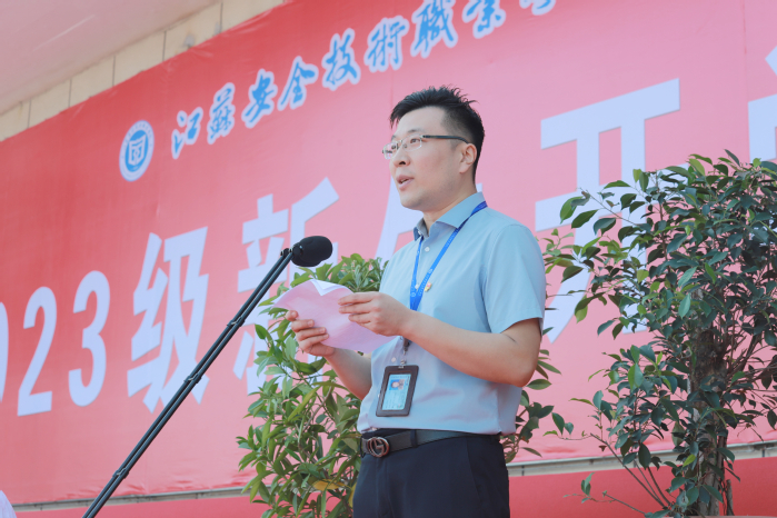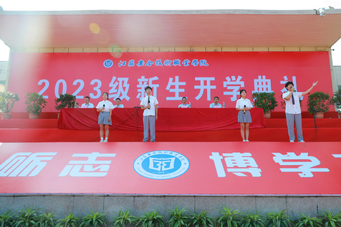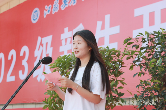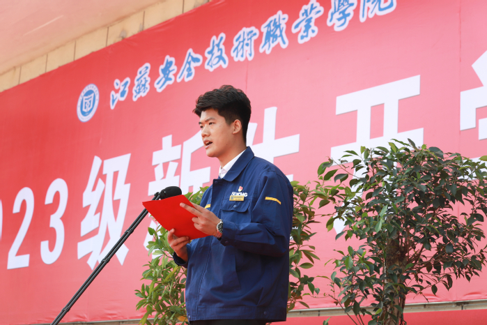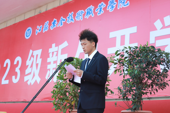 2023级数字媒体技�1班张诗涵同学、安全技术与管理�3+2”分段班新生代表郑锦民同学作为新生代表先后发言。他们用真挚的语言分享了自己初入大学校园的喜悦,号召全�23级新同学秉承“修德砺� 博学立新”的校训精神,不忘初心,在匠心筑梦、技能报国的青春赛道上勇往直前�