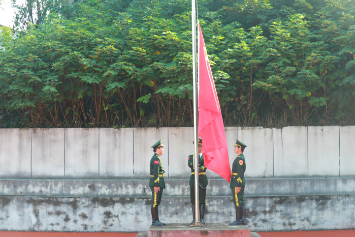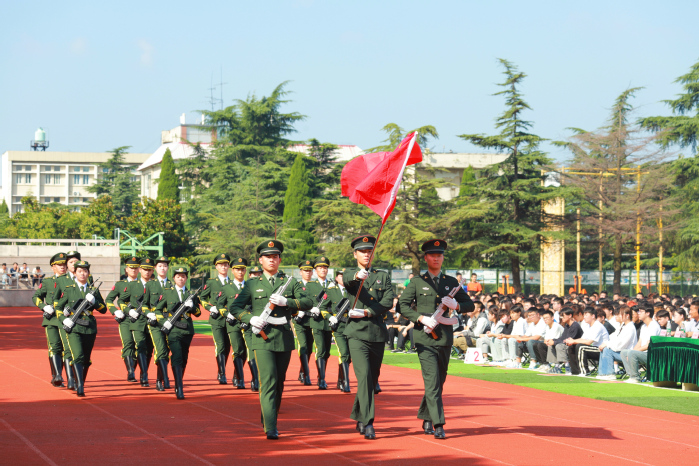 典礼开始前,舞蹈、诗歌朗诵、大合唱《歌唱祖国》点燃了典礼现场的气氛。随后,典礼正式开始,国旗护卫队迈着铿锵有力的步伐护送国旗缓缓走来。在全场新生的注目之下,伴随着雄壮的国歌声,鲜艳的五星红旗冉冉升起�