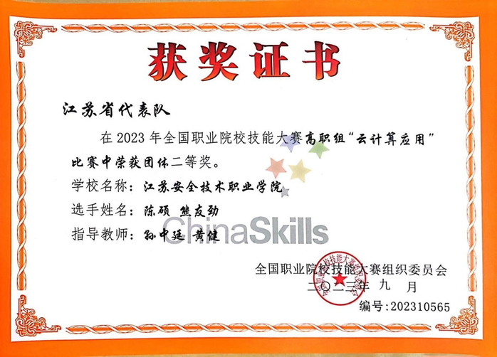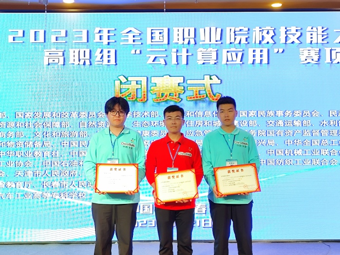 近日,全国职业院校技能大赛高职组“云计算应用”赛项在长春汽车工业高等专科学校拉开帷幕。经过激烈的比赛,我院网络与信息安全学院的陈硕和熊友劲同学斩获了二等奖,为学院增添了国赛标志性的光彩�