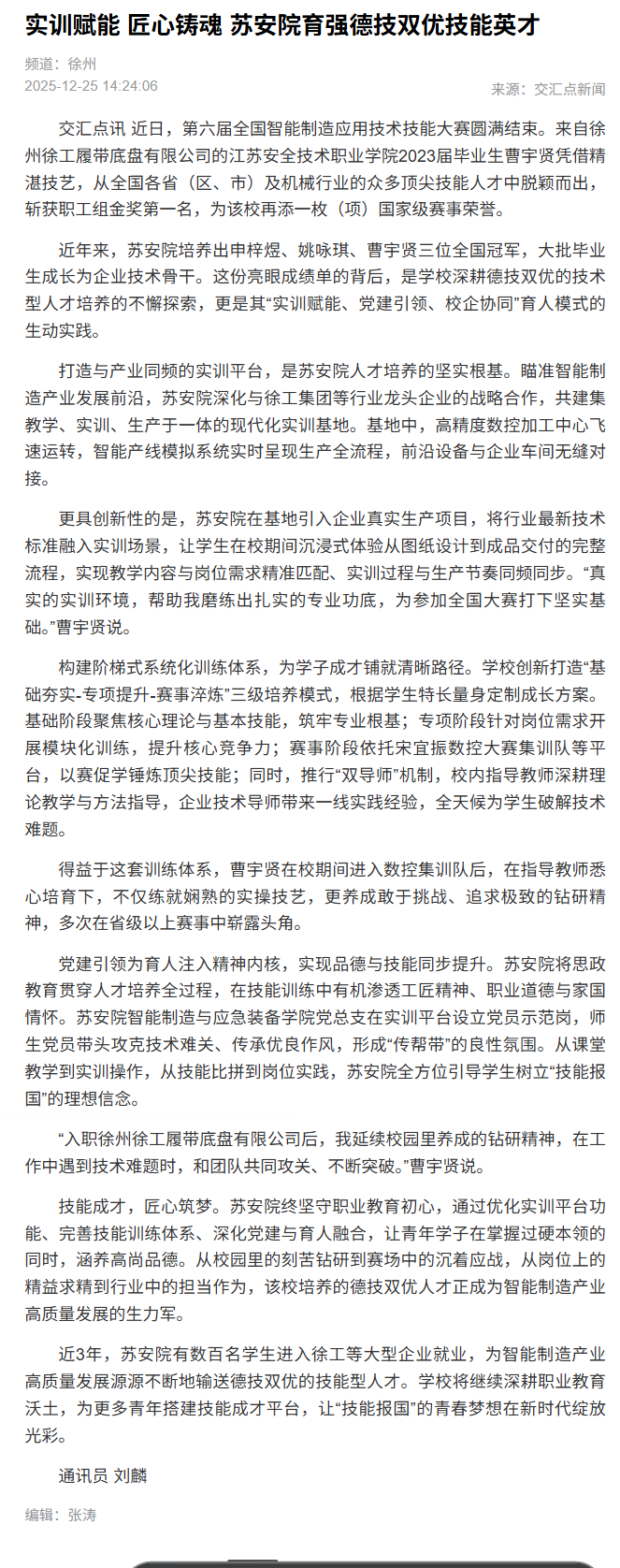 交汇点:实训赋能 匠心铸魂 苏安院育强德技双优技能英才