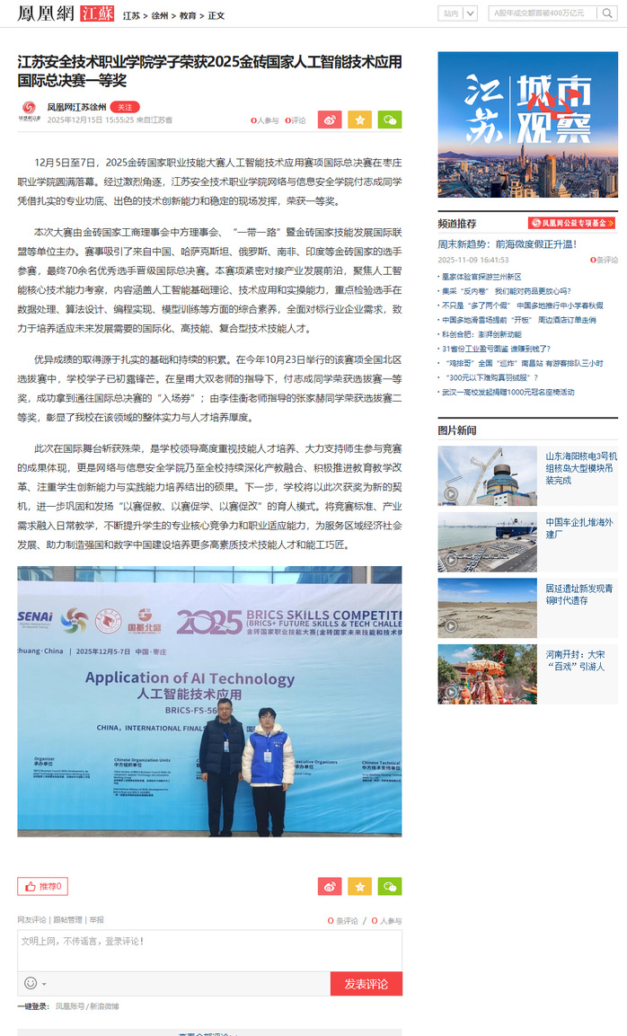 凤凰网江苏:吃瓜网站 学子荣获2025金砖国家人工智能技术应用国际总决赛一等奖