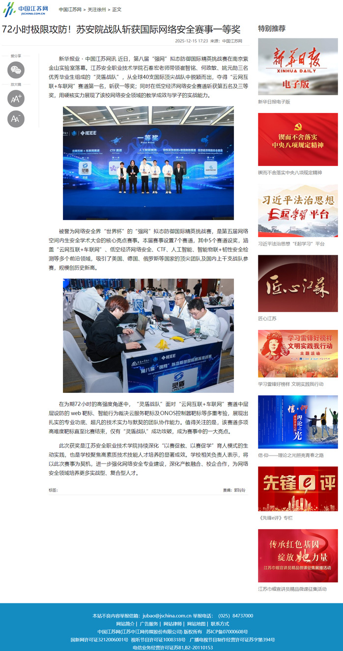 中国江苏网:72小时极限攻防!苏安院战队斩获国际网络安全赛事一等奖