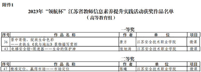 2023年“领航杯”教师信息素养提升实践活动获奖名单于近日发布,我院推荐的《景中寄情,绽放生命色彩 ——史铁生<我与地坛>景物描写赏析》(作者:唐方)、《电梯安全钳-限速器——生命的保护神》(作者:张旭涛)�2件作品获一等奖,《精准定位、赢得市场——市场定位》(作者:陈曦 )获二等奖。此次获奖数量及等级,实现了本赛项在我院的新突破�