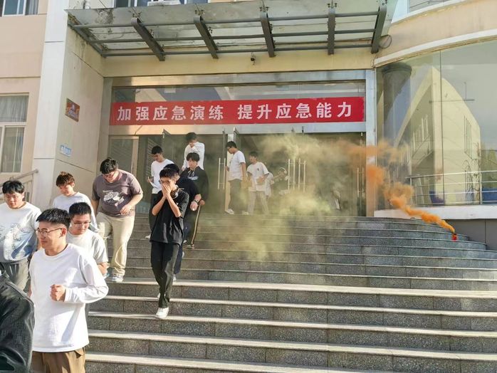 开展消防应急疏散演练。安保处和学工处联合开展消防应急疏散演练,各二级教学院部协同配合。疏散演练过程中,模拟火灾现场,在宿舍、教室内燃起烟雾,响起警报,参加疏散演练的学生在应�疏散演练小组工作人员的引导下,正确使用湿毛巾掩住口鼻,弯腰低姿迅速有序撤离。整个演练过程紧张有序,老师和学生们行动迅速、配合默契,达到了预期目的�