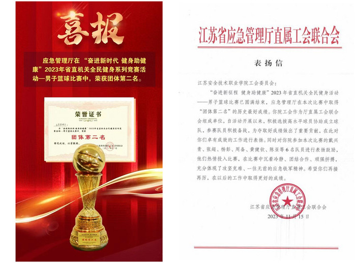 11�11日,2023年江苏省省直机关全民健身系列竞赛活动男子篮球比赛在南京奥体中心落下帷幕�71支省级机关代表队�852名运动员历时1个多月,经过144场比赛的激烈角逐顺利完赛。我院工会选送的6名男职工代表省应急管理厅组队参赛,最终以8�7胜的优异战绩获得本次比赛的团体第二名,创历史最好成绩,受到省应急管理厅表扬�