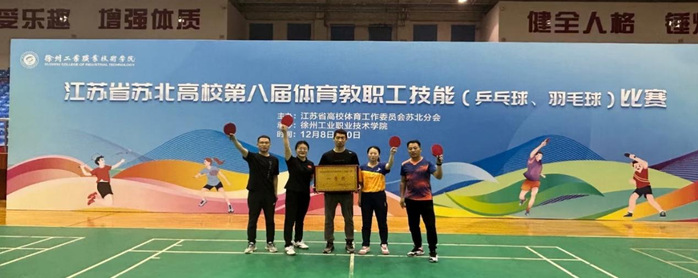 12�9日,由江苏省高校体育工作委员会苏北分会主办的江苏省苏北高校第八届体育教职工技能(乒乓球、羽毛球)比赛在徐州工业职业技术学院举行,经过激烈角逐,我院体育教师代表队荣获乒乓球团体一等奖的优异成绩�