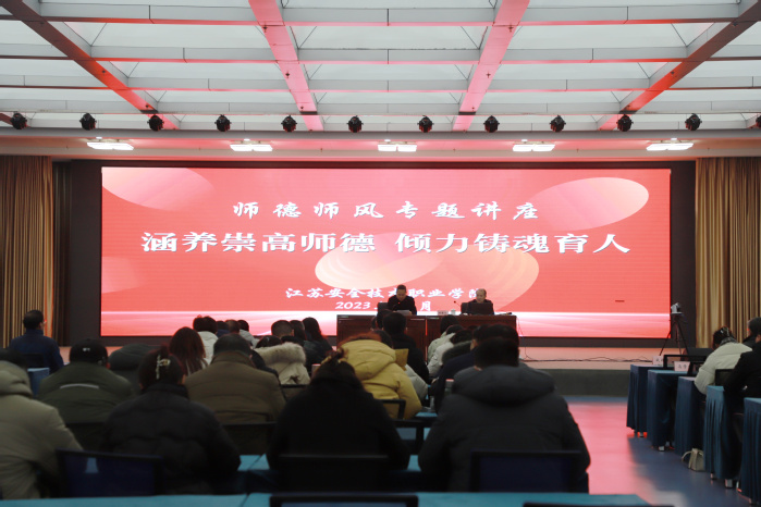 12�15日,学院特邀“时代楷模”“最美奋斗者”“全国道德模范”“全国优秀教师”教育部师德师风建设专家委员会委员曲建武教授,开展以《涵育崇高师� 潜心立德树人》为主题的师德师风专题讲座。讲座由学院党委副书记成伯君主持,全体教职工聆听了讲座�