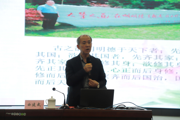 曲建武教授从传承大学文化、增强政治意识、怀有感恩之心三个方面论述教师应该涵养崇高师德,从坚定理想信念、工作脚踏实地、为学生解疑释惑、激励学生为祖国而学习、关心学生生活五个方面分享教师应该如何倾力铸魂育人�
