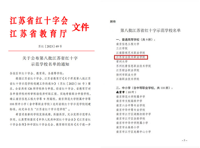 近日,江苏省红十字会、江苏省教育厅联合公布了第八批江苏省红十字示范学校名单,我院从全省参与申报的百余所学校中脱颖而出,荣获“江苏省红十字示范学校”称号�