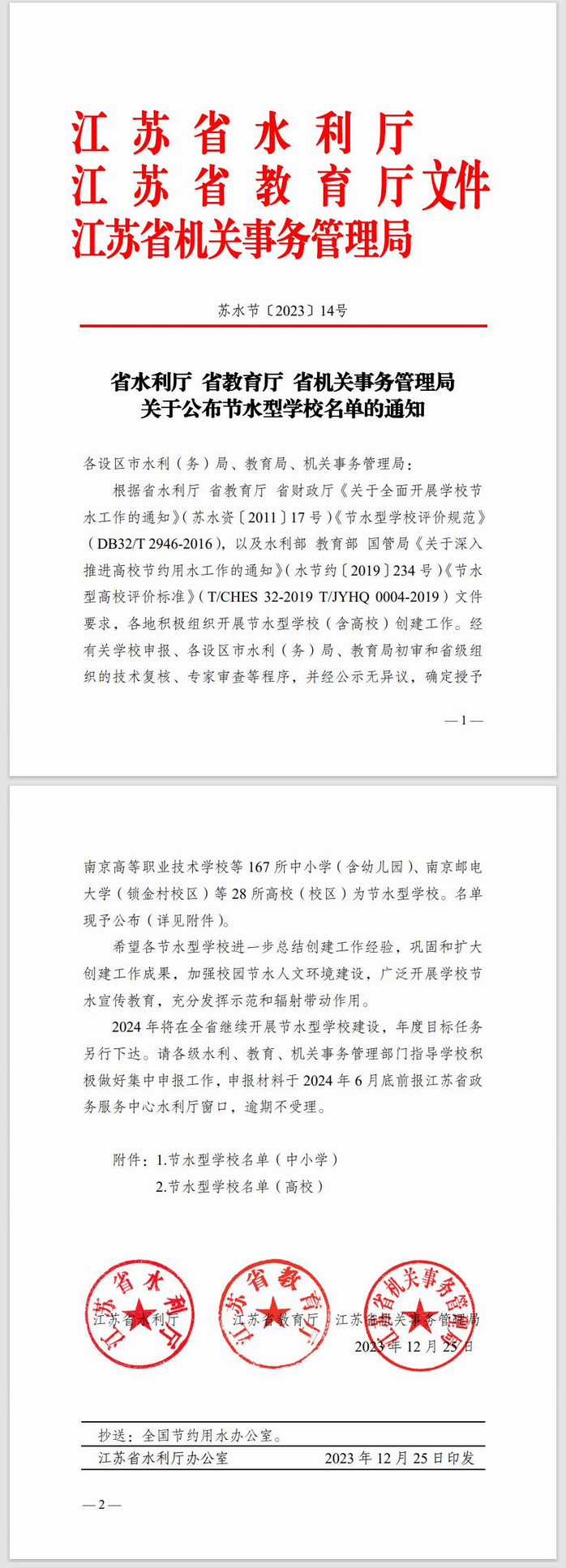 近日,省水利� 省教育厅 省机关事务管理局《关于公布节水型学校名单的通知》发布,经学院申报,徐州市水利(务)局、教育局初审和省级组织的技术复核、专家审查等程序,经公示无异议,我院确定被授�江苏�2023年度“节水型高校”荣誉称号�