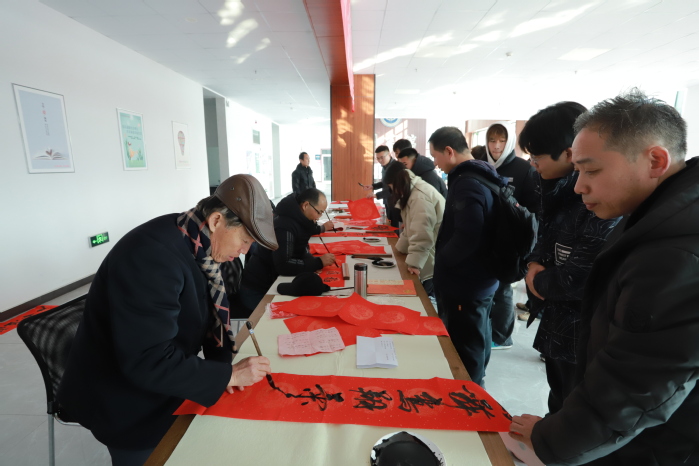 欢乐祥和迎新春,翰墨飘香送祝福。来自学院退休教职工书法爱好者和教职工书法社团人员,现场为师生员工书写春联和福字。大家饱含创作热情,挥毫笔墨、妙笔迎春,隶书、楷书等多种书体各具特色、各显神韵。红纸间笔走龙蛇,翰墨飘香,新春气息和美好祝愿的春联呼之欲出,一副副春联焕发着喜庆的气息,甚有师生�看谱点菜�,请书法老师为自己题写中意的春联,活动现场气氛热烈、年味十足�
