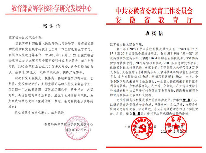 近日,学校收到来自教育部高等学校科学研究发展中心、安徽省委教育工委、安徽省教育厅发来的感谢信和表扬信�