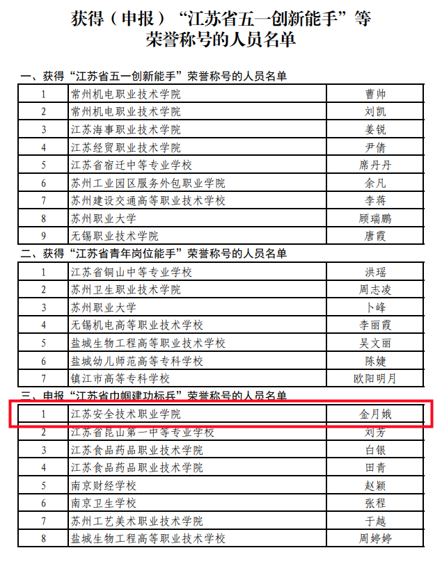 根据省教育厅、省总工会、共青团省委、省妇联《关于举�2023年江苏省职业院校教学能力比赛的通知》(苏教职函�2023�19号)安排�2023年全省职业院校教学能力比赛各项赛事已圆满完成。金月娥�8位同志由主办单位按程序向省妇联申��江苏省巾帼建功标��称号�