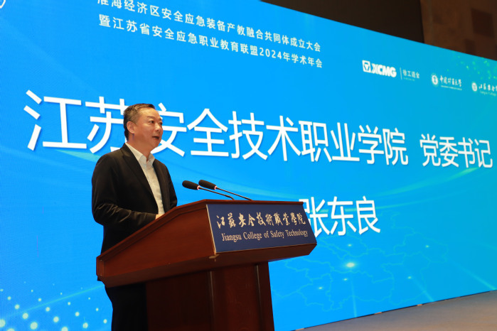张东良代表学院致辞。他表示,共同体的成立是我院贯彻落实党的二十大精神和党中央、国务院有关文件要求,推进产教融合的重大举措。他指出,共同体的成立旨在充分发挥资源聚集优势,推动安全应急装备赋能教育强国、人才强国建设,推进教育、科技、人才一体化发展,必将对深化产教融合、职普融通、科教融汇产生积极的推动作用。作为共同体的牵头单位之一,学院将紧密依托江苏省安全应急职业教育联盟平台,探索共同体运行体系建设,为推动安全应急装备赋能安全应急行业产教共同体发展,助推中国式现代化贡献力量�