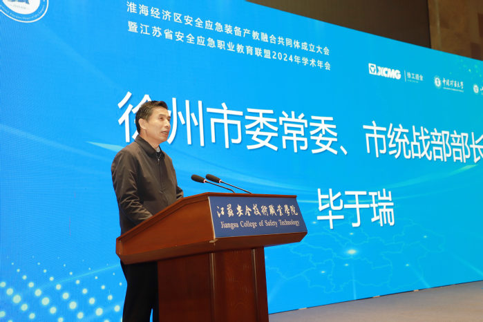 毕于瑞代表徐州市委统战部对淮海经济区安全应急装备产教融合共同体的成立表示热烈祝贺,向远道而来的各位领导、嘉宾表示热烈的欢迎。他指出,共同体的成立不仅是推动产业转型升级的必然选择,更是提升区域综合竞争力的重要体现,也将成为推动区域间交流合作的重要桥梁。希望共同体不断发挥示范引领作用,通过校企协作、校际交流、企企合作等形式,不断打造全国一流的安全应急管理人才供应链、科技研发链、产业融合链,助推安全应急装备产业的高质量发展,为区域经济社会发展作出新的更大贡献�
