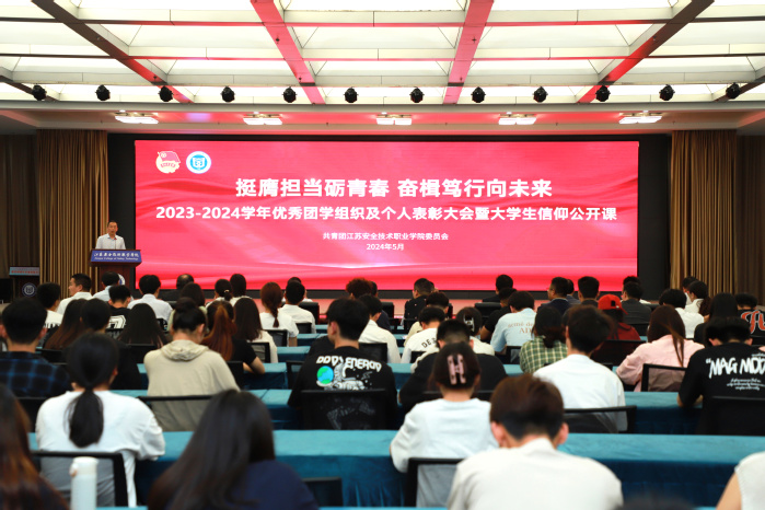 为庆祝新中国成立75周年,纪念五四运�105周年�5�10日,学院在云龙校区举行“挺膺担当砺青春 奋楫笃行向未来�2023-2024学年优秀团学组织及个人表彰大会暨大学生信仰公开课活动。党委书记张东良,党委副书记成伯君,副院长吉智,党委委员、宣传部部长李志浩出席大会并颁奖。教务处、学工处、团委等部门相关负责同志,各二级学院党总支书记、副书记,受表彰先进集体和个人代表,各二级学院青年师生代表等200余人参加大会�