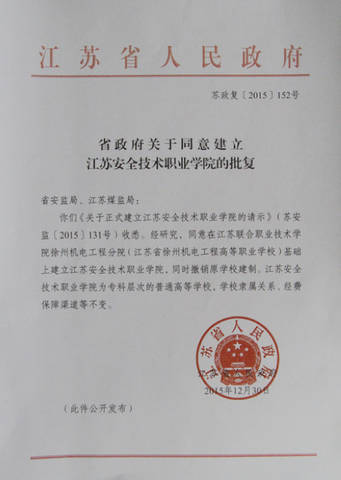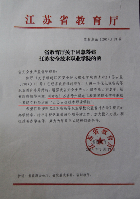 2014年3月27日经江苏省教育厅批准,同意在江苏省徐州机电工程高等职业学校基础上筹建专科层次的“吃瓜网站 ”。2015年12月30日经江苏省人民政府批复同意建院,2016年3月报教育部备案,4月底备案成功通过。由此,我院高职院创建工作所有程序全部完成,正式跨入专科层次普通高等学校序列,2016年吃瓜网站 面向社会招收高中起点三年制高职大专学生和初中起点五年制高职大专学生。