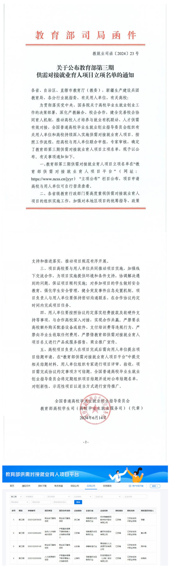 近日�教育部高校学生司公布了第三期供需对接就业育人项目立项名单,我�与相关企业联合申报的4个项目获得立��其中包括智能制造与应急装备学院与青岛海尔人力资源开发有限公司和杭州海康威视数字技术股份有限公司申报的就业实习基地项目2项,网络与信息安全学院与嘉环科技股份有限公司申报的定向人才培养培训项�1项,商贸与人文学院与珍岛信息技术(上海)股份有限公司申报的人力资源提升项目1项�