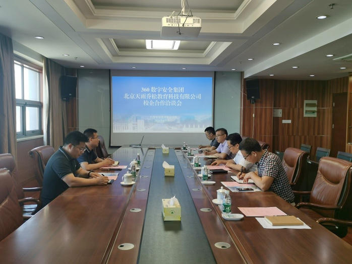 6�26日,360数字安全集团教育行业总经理李强、北京天雨乔松教育科技有限公司营销总监彭璐一行到学院开展校企合作洽谈。副院长吉智出席洽谈会,产教融合办公室及网络与信息安全学院相关负责同志参加洽谈�