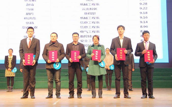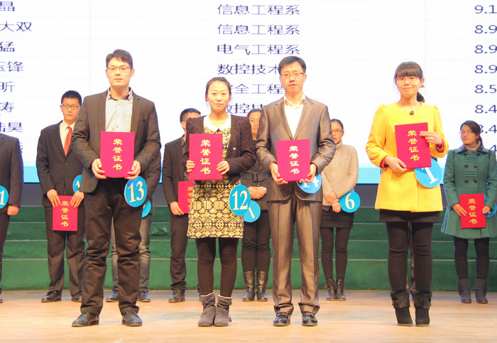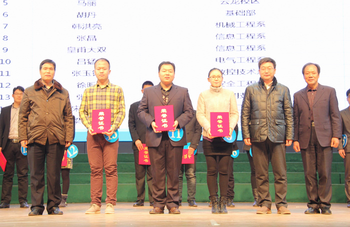 副校长任国兴、邓守林,工会主席陈忠华为荣获二等奖的选手颁奖