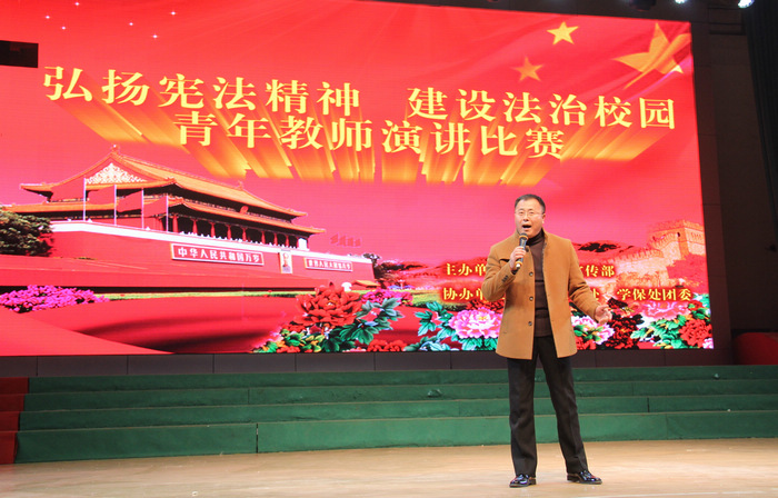 12月24日,学校在文化中心举办了“弘扬宪法精神建设法治校园”青年教师法治演讲比赛,本次演讲比赛由工会宣传科、组织人事处、学保处团委联合举办。党委书记孙健身出席活动并讲话,校领导任国兴、薛莲、成伯君、邓守林,全体教职工和部分学生观看演讲比赛。