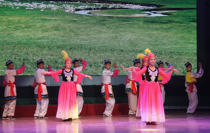 新疆班同学在“庆国庆·迎新生”晚会上表演民族舞蹈《摘葡萄》