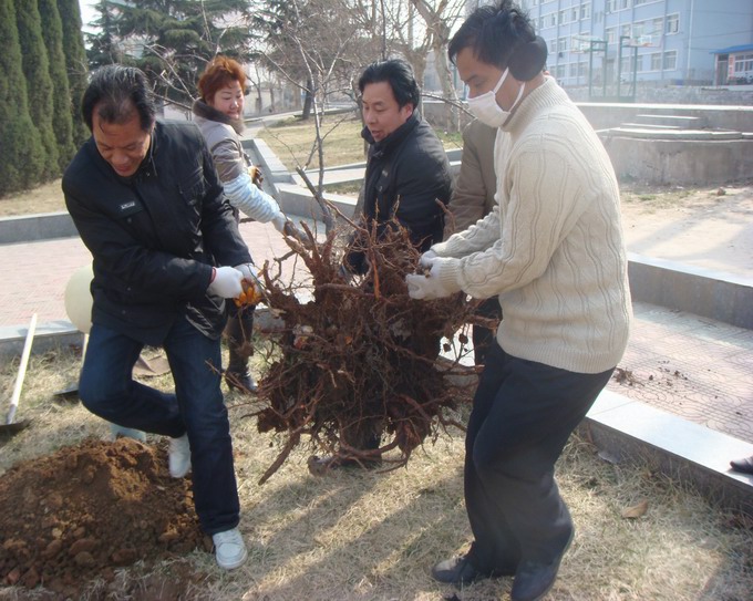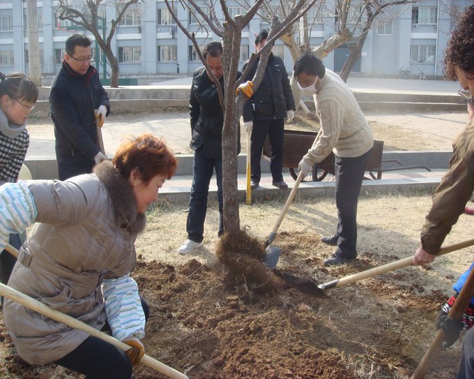 在明确了劳动任务后,大家手持铁镐、铁锹等工具,来到责任区。植树活动在愉快、团结的氛围中展开,大家协同努力,一鼓作气,挖坑、移树、填土、浇水……大家都希望通过自己的劳动能够为我们的校园多添一分绿色,使校园更加美丽充满生机!