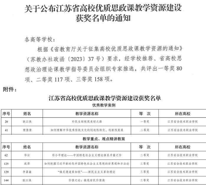 近日,江苏省教育厅社政处公布2023年度征集的思想政治理论课教学资源获奖名单,我院获奖6项,其中,一等奖1项(优秀教学案例);二等�2项(教学重难点教案、优秀教学案例�1项),三等奖3项(教学重难点教�3项),是在徐高职院校获奖最多的学校�