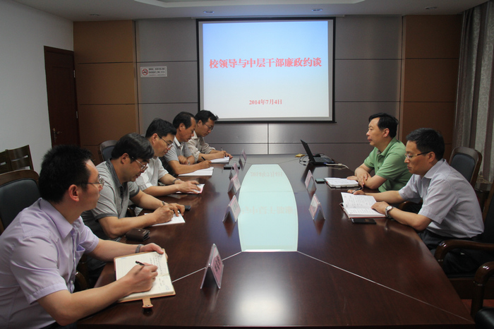 7月4日上午,校党委书记孙健身同志与校党政办公室主任刘新立、副主任邓宝方、组织人事处处长王体民、宣传部工会主席陈忠华、纪检专职干事刘军五位中层干部进行集体廉政谈话。孙书记从廉政建设责任主体、加强教育、完善制度、强化权力监督等方面入手,强调领导干部除加强自身建设外,还要管好身边人,带好队伍。