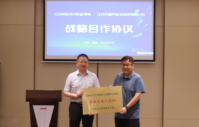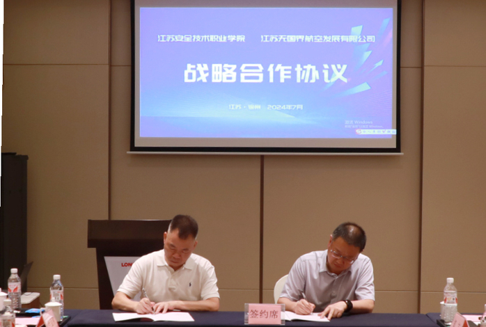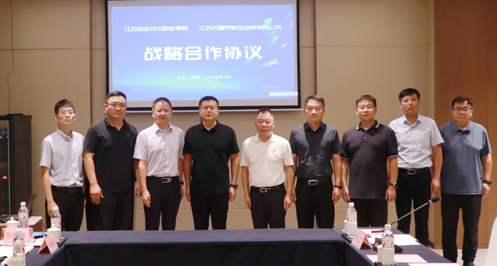 7�25日,学院与江苏无国界航空发展有限公司签署校企合作战略协议,举行“潘安湖民航局无人驾驶航空器操控员执照培训基地”揭牌仪式。徐州市贾汪区区委常委、副区长孟磊,江苏无国界航空发展有限公司董事长黄飞建,学院纪委书记、监察专员朱伟军,中国移动通信集团江苏有限公司贾汪分公司副总经理李金秋等领导出席仪式,校政企各方相关人员参加仪式�